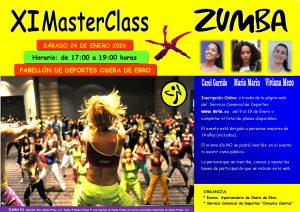 El sábado 24 de Enero a las 17 horas, en el Pabellón de Osera de Ebro, organizamos la XI Masterclass de Zumba. La actividad estará dirigida a todas las personas interesadas mayores de 14 años (incluidas).